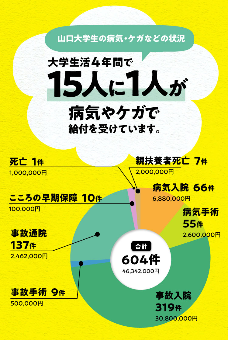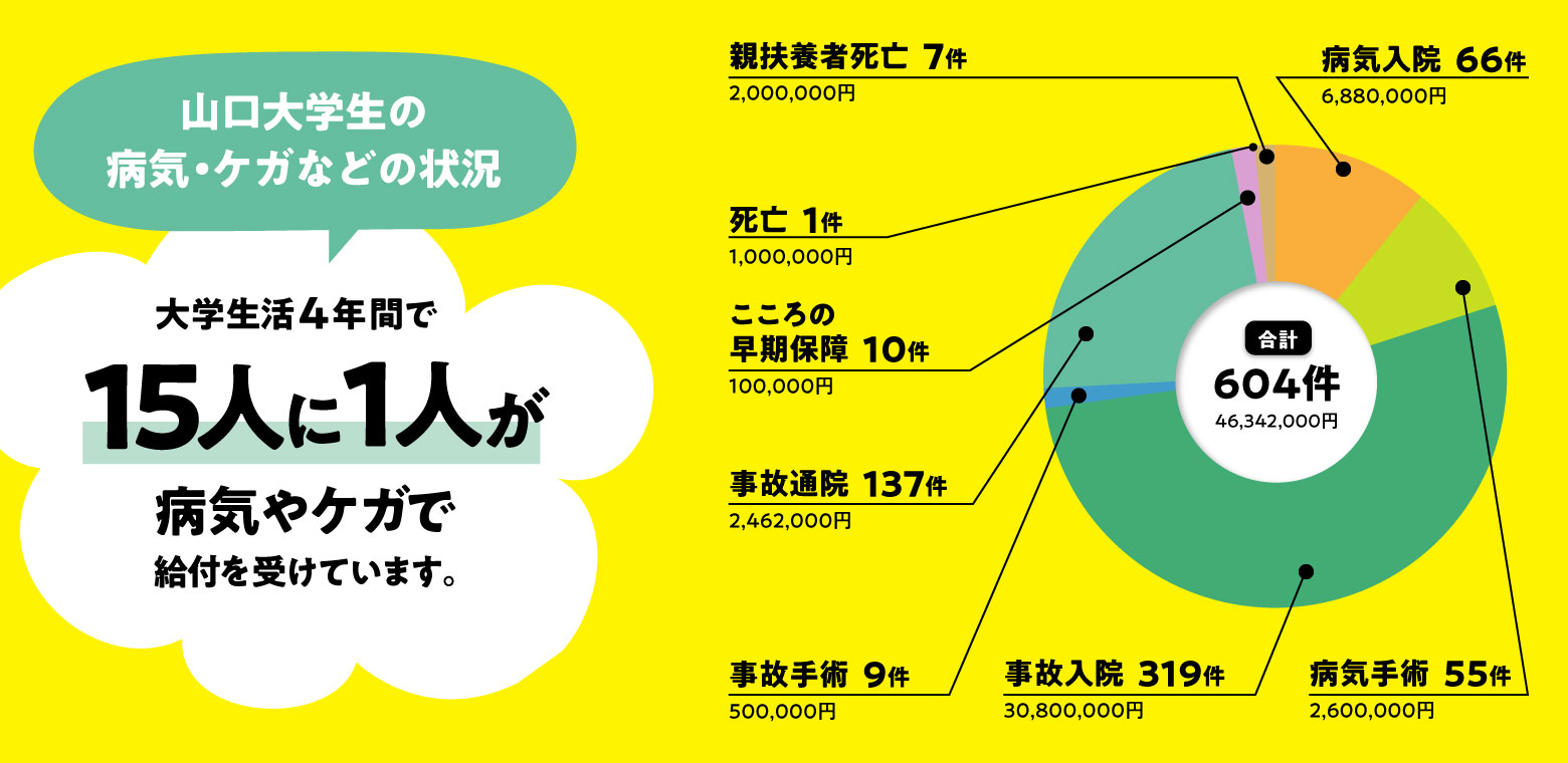 24時間365日・学内外・国内外を問わず学生本人のケガや病気に備える保障があります。