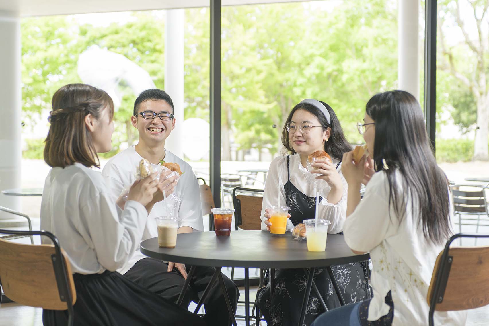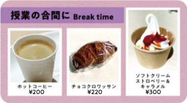 焼きたてパン、サンド、ワンプレートランチ、パスタ、ホット丼弁当などのフードメニュー、コーヒー系ドリンクもメニューが充実!ソフトクリームも!授業の合間の休憩や勉強場所としてもご利用可能です。