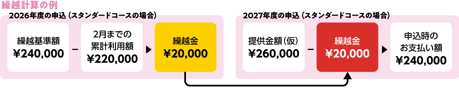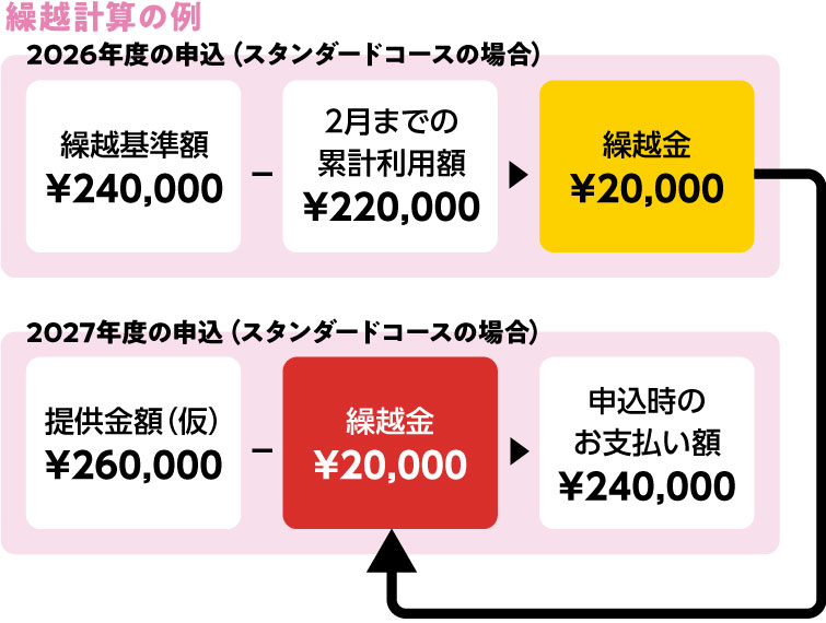 スタンダードコースの方が繰越金の計算例にて仮に60,000円と算出された場合、翌年度(2027年度)継続において適用可能な繰越金は50,000円です。差額10,000円は失効となります返金(換金)はございません。 - 繰越サービスは、翌年度継続申込をされる方にのみ適用します。期限は2027年3月31日までです。未継続者の繰越金は失効となり返金(換金)はございません。