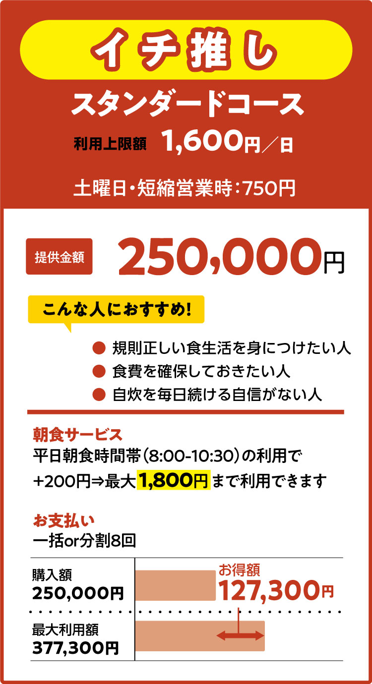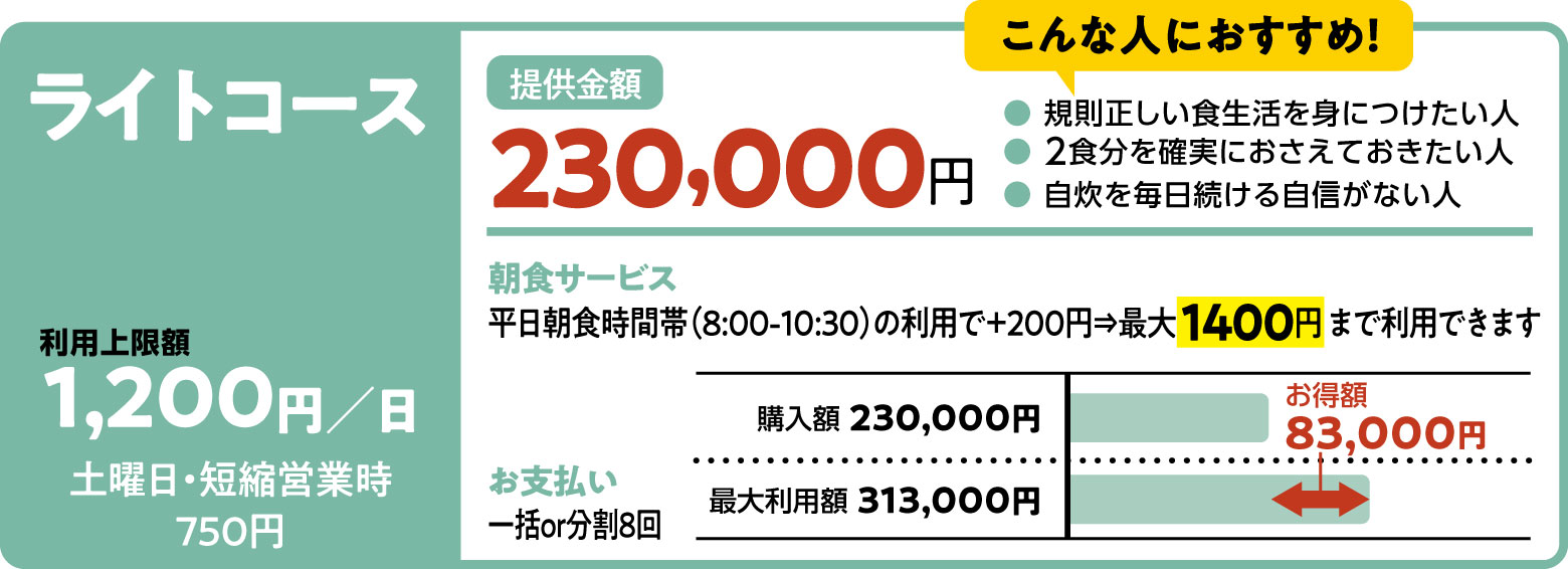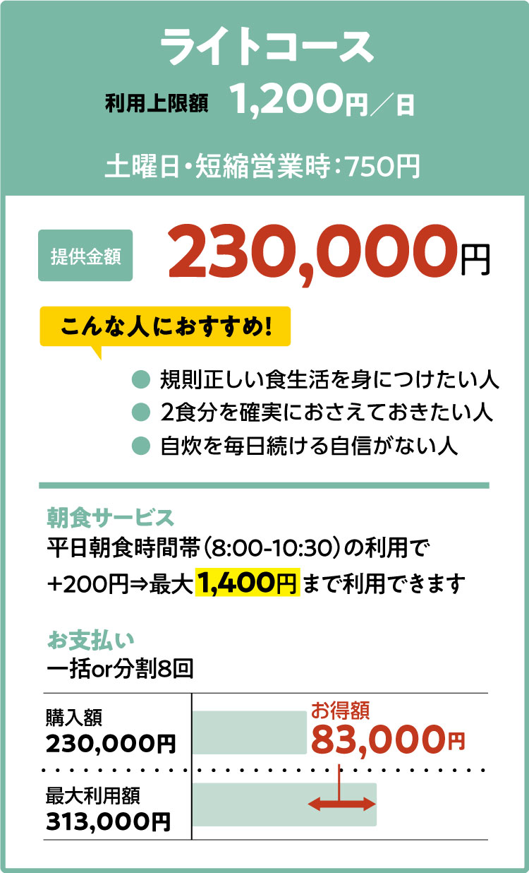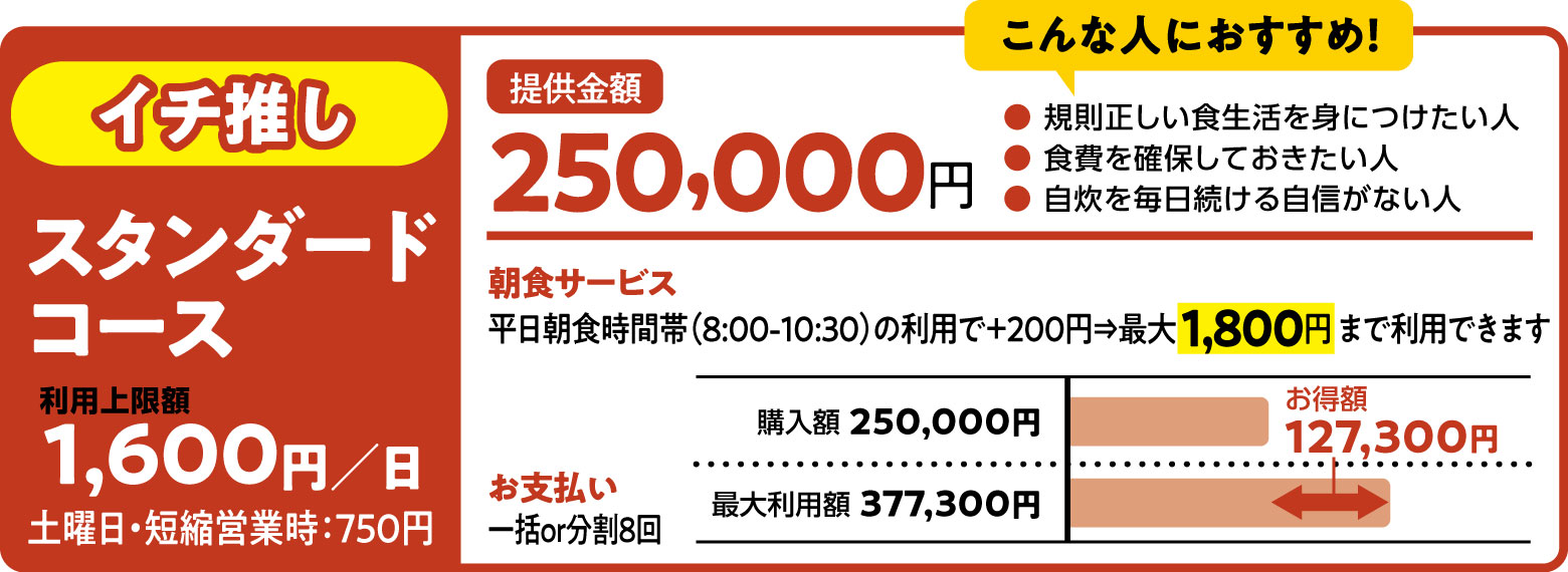 - 1日の利用上限額までなら何度もご利用可能です。ライフスタイルに合わせてご利用ください。上限額をオーバーした場合は電子マネー「CHORUCA」にてお支払いください。食育の観点から、1回にまとめてお食事(どか食い)は極力お控えください。